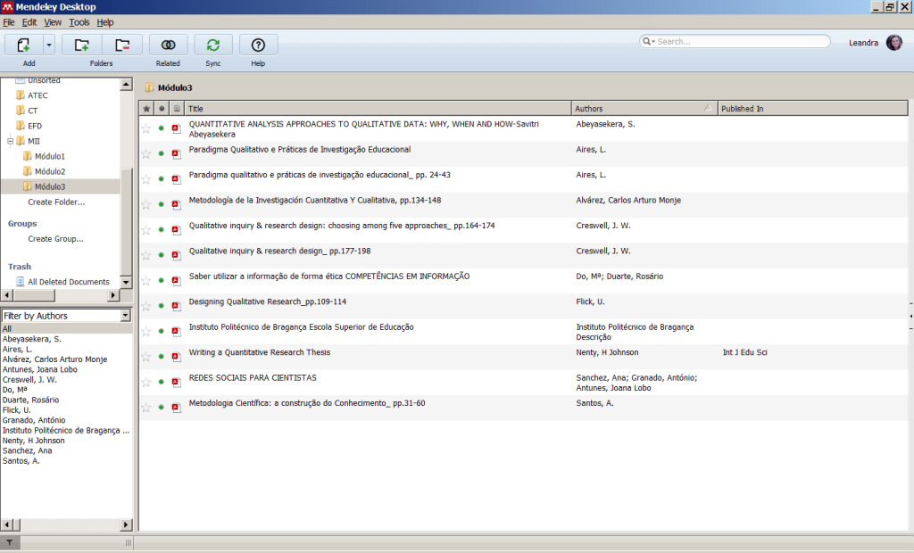 A metodologia de ensino participativa e a forma de exploração do conteúdo proposta na UC foi um estímulo para a construção da minha base como investigadora, transmitindo o gosto pela investigação científica. Neste cariz, destaco o registo no ResearchGate e a criação do meu perfil e uso do software Mendeley. Foi a primeira vez que tive contacto com estas duas ferramentas e estou a utilizar o Mendeley de duas formas, na versão Desktop instalada no meu portátil e na versão Web para gerir as minha base de dados com as referências bibliográficas que estou a estudar. Um grande ponto positivo do Mendeley é que esta ferramenta auxilia na criação das minhas citações e referências de acordo com as orientações emanadas pela American Psychological Association (APA) – confesso que ainda estou em fase de adaptação com este modelo de referenciação normativa. Além disso, cabe mencionar que estou a utilizar o Mendeley para organizar e gerenciar os textos das outras UC’s que estou a cursar no mestrado, criando uma base centralizada com todas as minhas fontes bibliográficas.