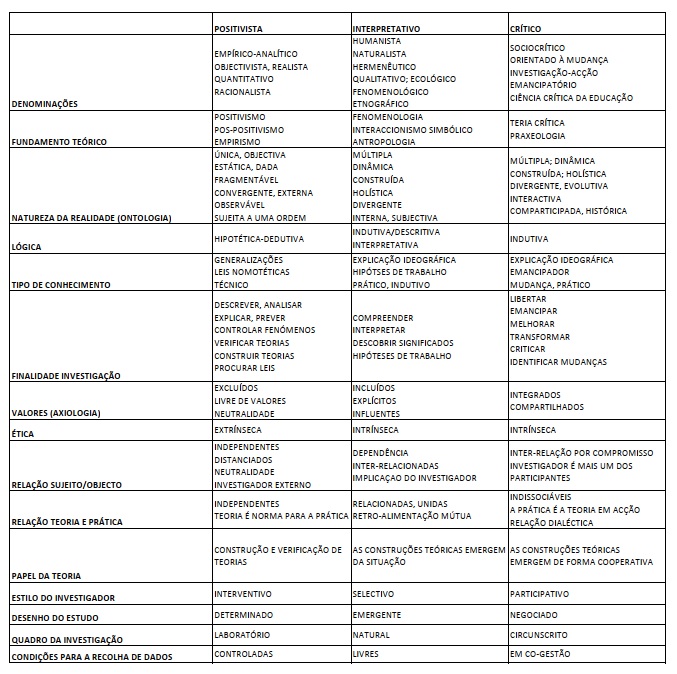 Abaixo, quadro com a comparação de características dos três paradigmas apresentados, adaptado de Lukas e Santiago (2004, p.33) e disponibilizado por Coutinho, C. (2011, p.21)