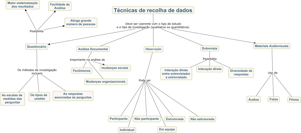 As técnicas utilizadas para recolher dados devem ser escolhidas conformo tipo de estudo a ser desenvolvido, bem como conforme o tipo de investigação, qualitativa ou quantitativa. As principais técnicas de recolha de dados são: